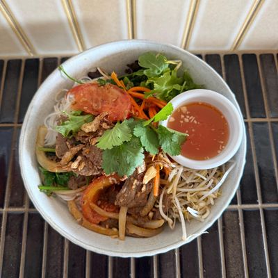 Unami stir fried beef, rice vermicelli noodles, mixed leaves, bean sprouts, pickled carrot served with nuoc cham