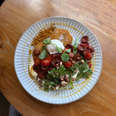 Two fried potato rosti with chorizo, cherry tomatoes, whipped feta, rocket, poached egg, topped with toasted almonds and hot honey
